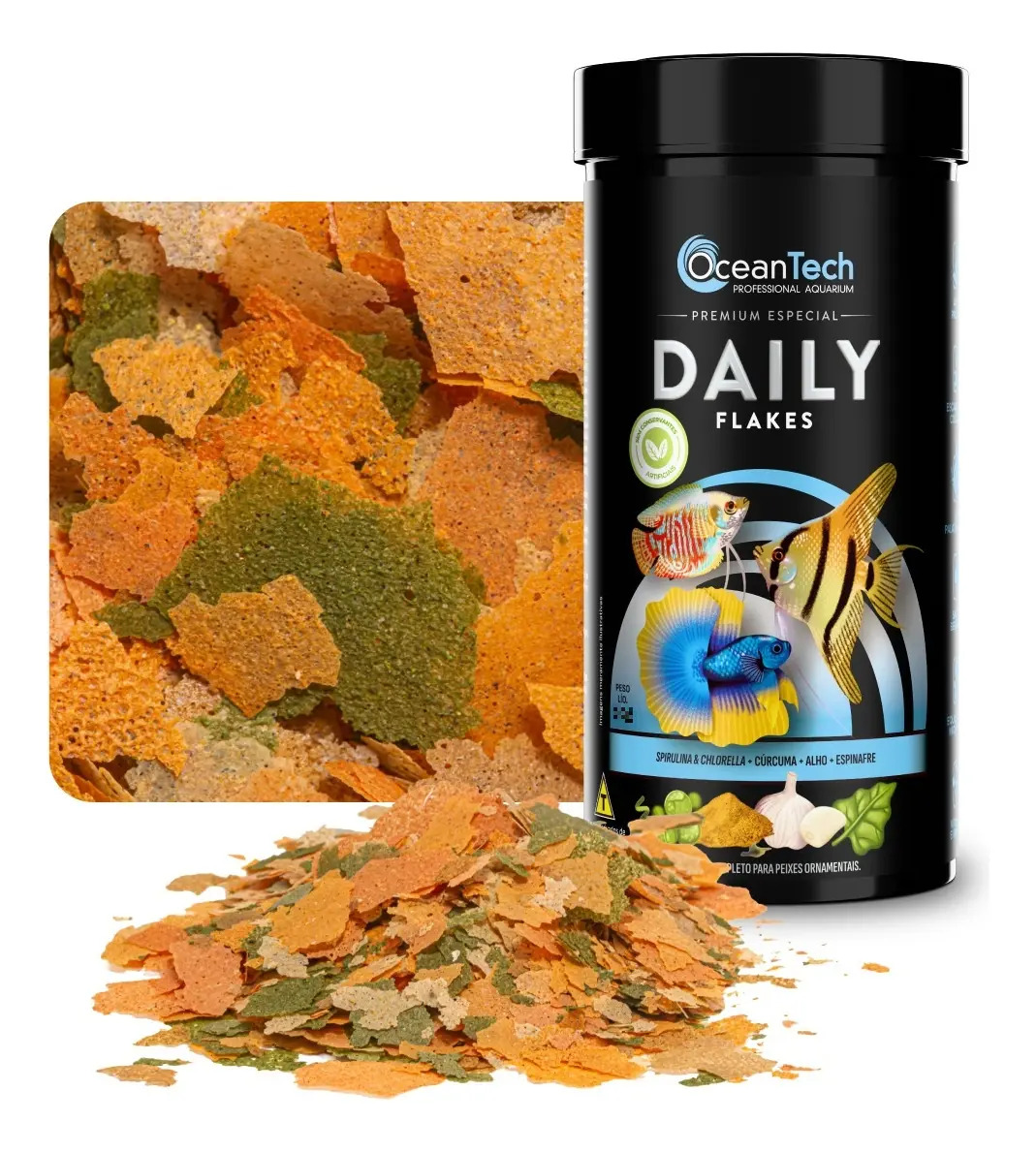 O alimento Daily Flakes possui ingredientes funcionais, como a astaxantina, a cenoura e o espinafre, que são fontes de carotenoides naturais e que ajudam a ressaltar a coloração vibrante dos peixes, proporcionando escamas mais brilhosas.